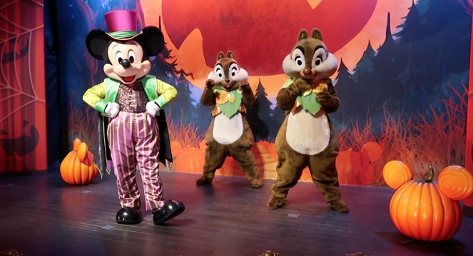 Mickey et Minnie accueillent ainsi les visiteurs en costumes dâHalloween sur la gare de Main Street USA dĂšs le matin, suivis de Daisy et Donald en tenues dâautomne ( issus de la parade habituelle dâHalloween ) et de Dingo et Max eux aussi en costumes orangĂ©s đ§Ą